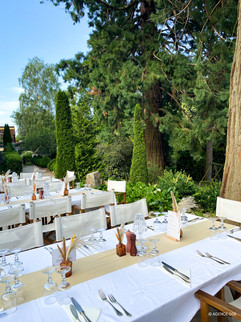 Déjeuner 3 plats servi sur la terrasse du domaine : un moment de convivialité ensoleillé pour poser les bases du séminaire.